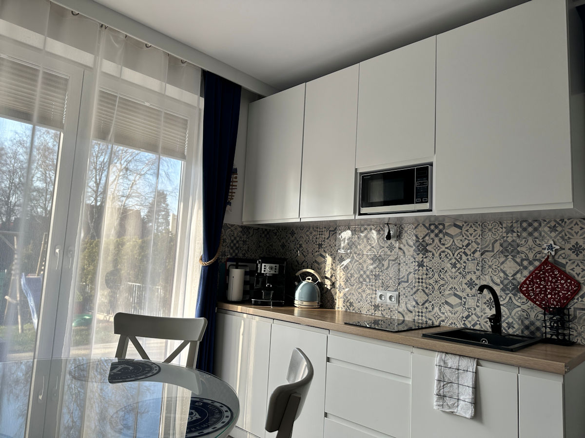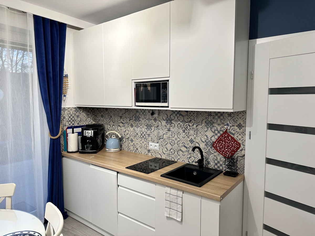Całkowite wyposażenie w naczynia i zastawę dla 4 osób, garnki, płyta indukcyjna, kuchenka mikrofalowa, zmywarka, lodówka z zamrażalnikiem , czajnik bezprzewodowy, expres do kawy, toster, środki czystości.