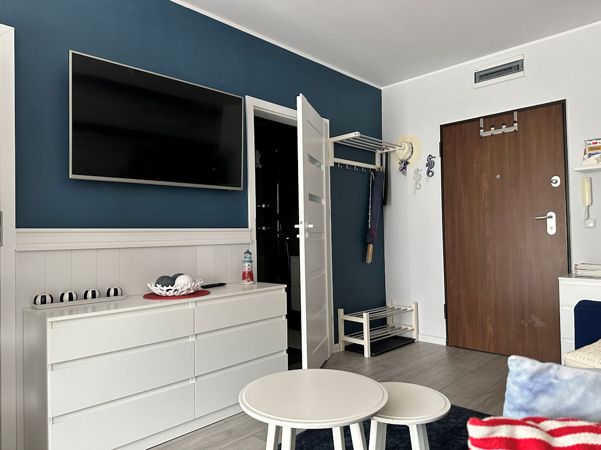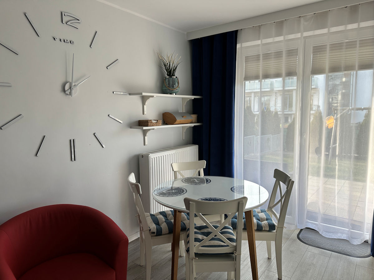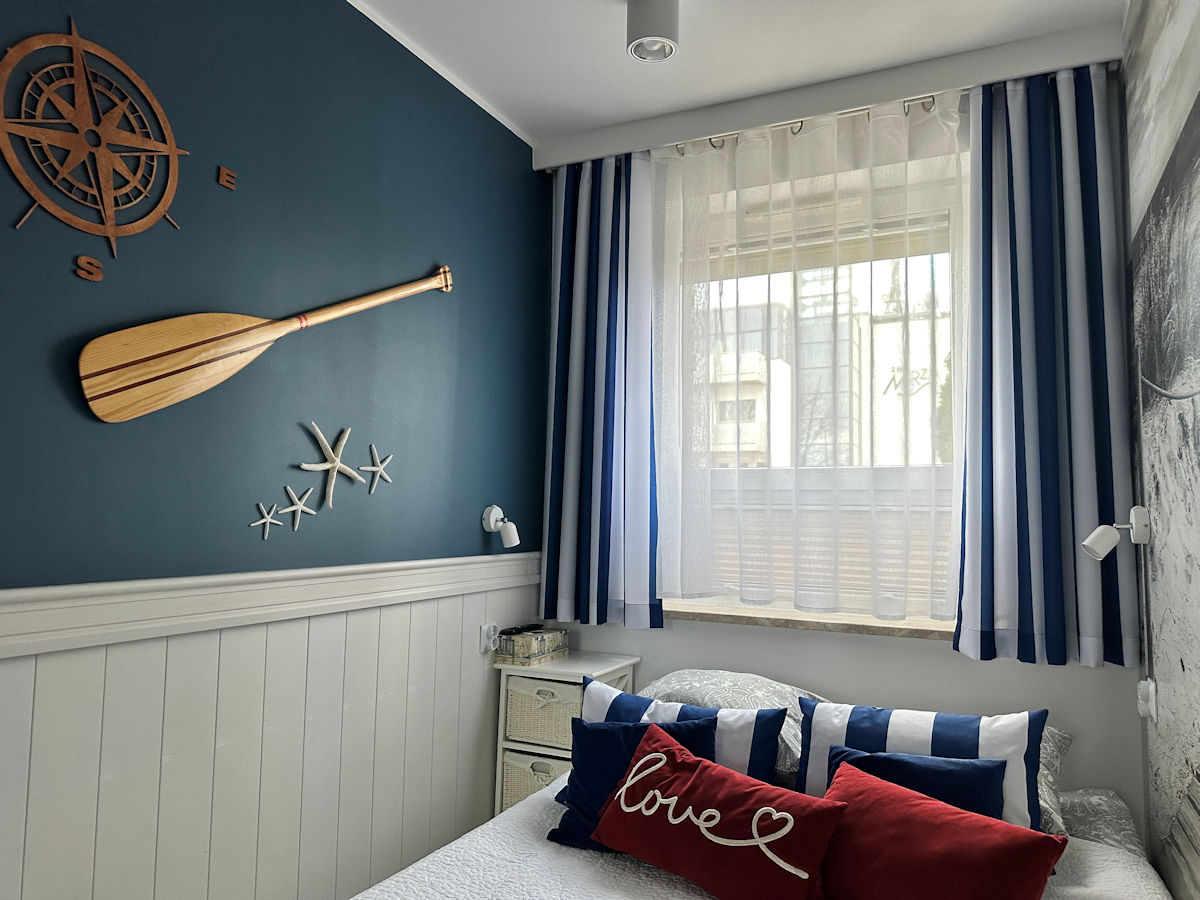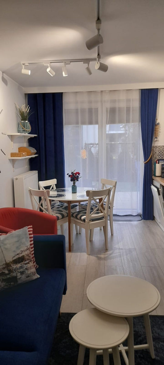 Urządzony z akcentami marynistycznymi. Do dyspozycji ogrodzony prywatny ogródek z placem zabaw dla milusińskich wypoczywających w apartamencie.
