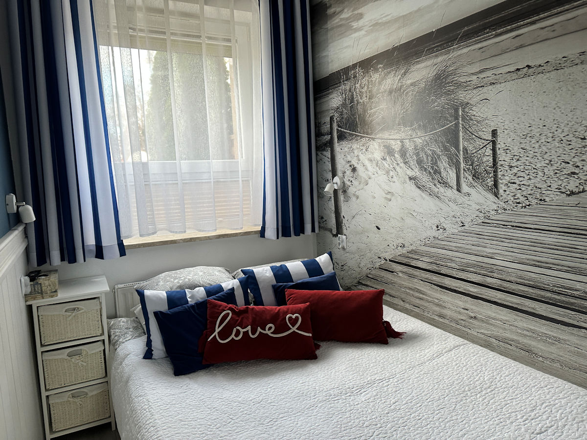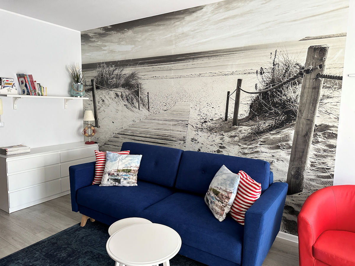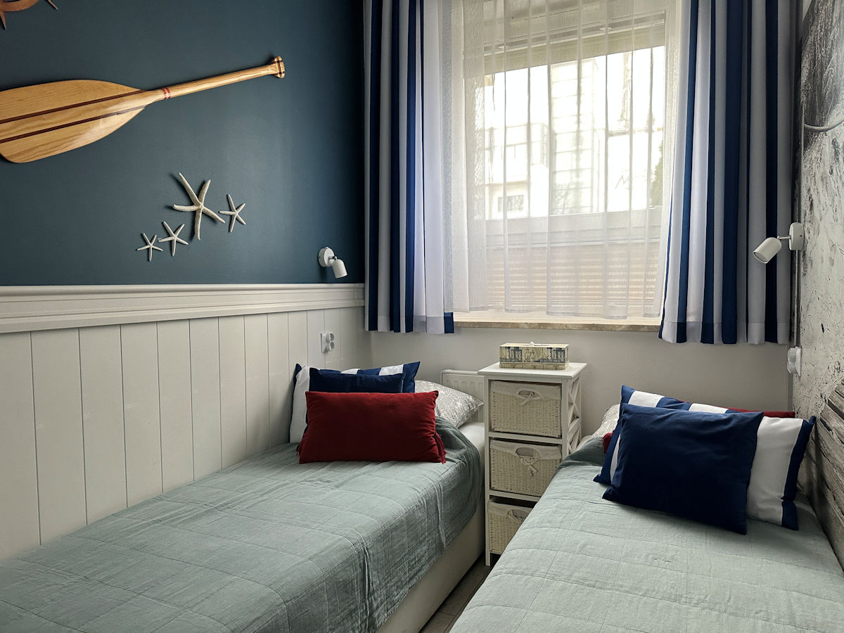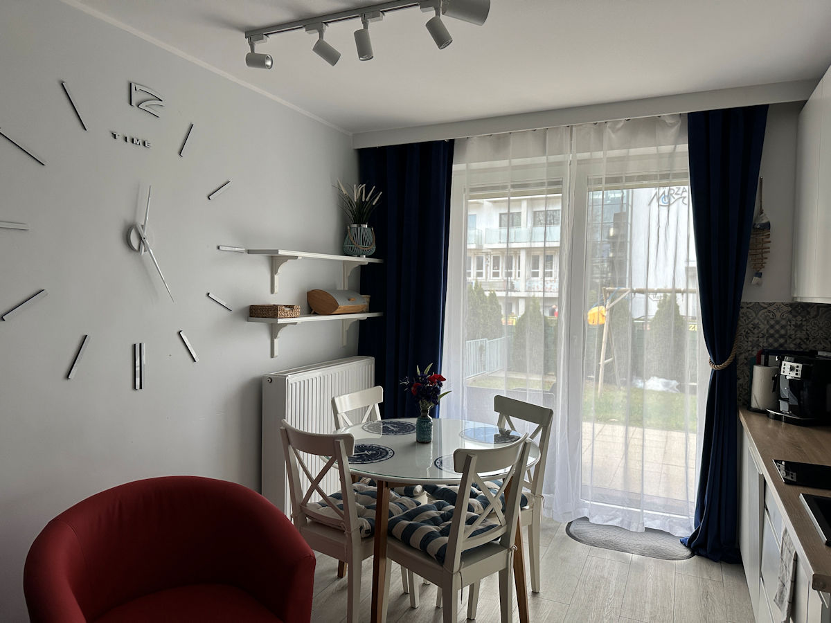 Urządzony z akcentami marynistycznymi. Do dyspozycji ogrodzony prywatny ogródek z placem zabaw dla milusińskich wypoczywających w apartamencie.