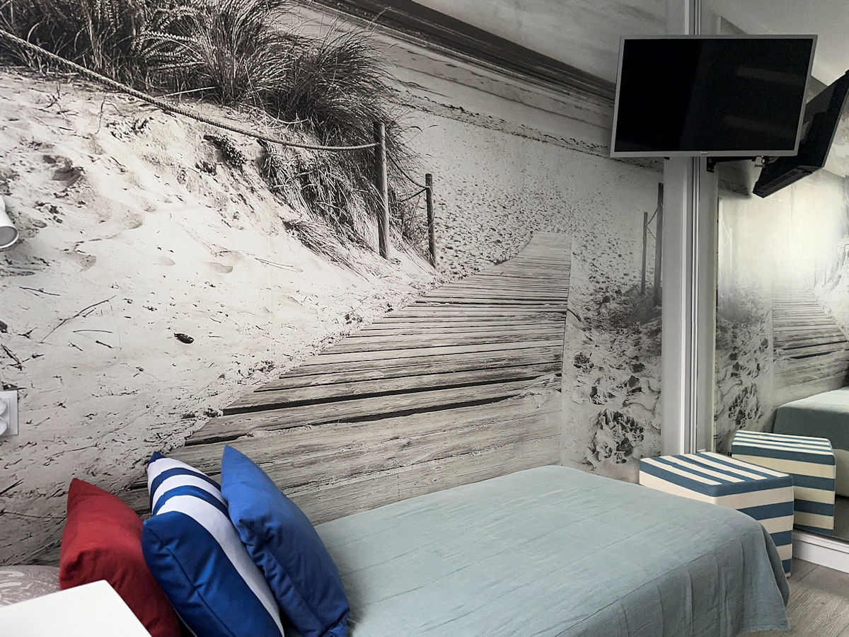 Sypialnia 2 pojedyncze łóżka 70 x 200 cm, możliwość złączenia w jedno duże łoże 140 x 200 , stolik, lampki nocne, duża pakowna szafa z lustrem, komfortowa pościel, mieści się łóżeczko turystyczne